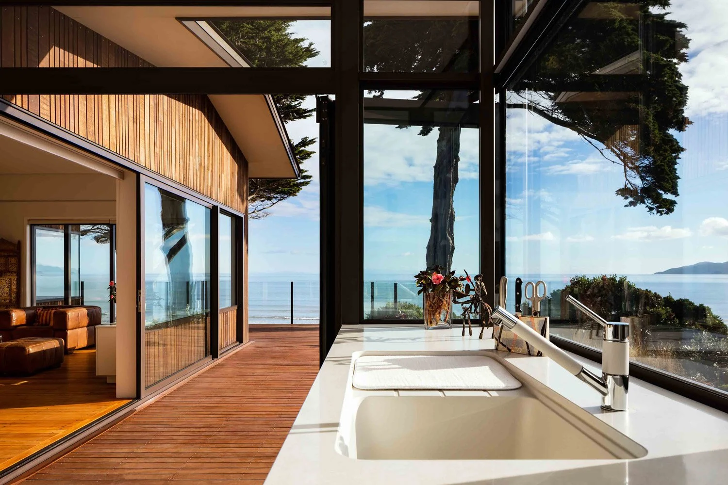 Sustainability and durability were central to every design decision. FSC-certified New Zealand timbers were used throughout, including salvaged and repurposed flooring from the original bach. Low-VOC finishes and NZ-sourced materials were prioritised, and a comprehensive waste minimisation programme was followed during construction. All external walls are double framed, ceilings are suspended to reduce thermal bridging, and the wall cladding includes oiled NZ Beech and Tauranga sandstone. A concealed-fixing aluminium roof was selected for longevity and resistance to the coastal environment.